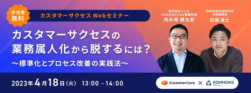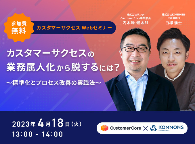 本セミナーでは、そんな「カスタマーサクセス業務の標準化」をテーマとして、属人化した業務をどのタイミングでどのように標準化していくか、活動方針のカギとなる顧客データの活用といったポイントを、カスタマーサクセス支援サービスを提供する2社でお話しします。